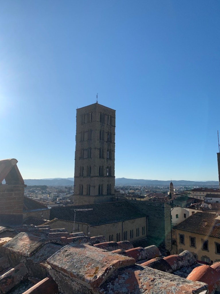 Moreover, the wonderful museum of Fraternita dei Laici is located in the western area of the piazza. Its collection includes paintings, sculptures, books, and other works from various time periods. At the top of the building, there is a sixteenth-century clock that functions to this day. As you can see in the pictures, visitors are allowed to climb the clocktower and enjoy a wonderful view of the city. Our Art History Professor, Alessandra Baroni, worked in this museum for many years and she was able to give us a great tour of the place. In addition to Fraternita dei Laici, Giorgio Vasari’s Palazzo delle Logge and the beautiful Church of Santa Maria della Pieve are also located in Piazza Grande.